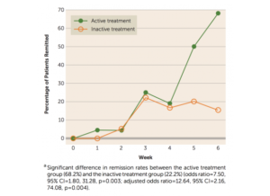 Patients also experienced minimal side effects from the therapy. No one experienced mania or hypomania, a condition that includes a period of elation, euphoria, irritability, agitation, rapid speech, racing thoughts, a lack of focus and risk-taking behaviors.